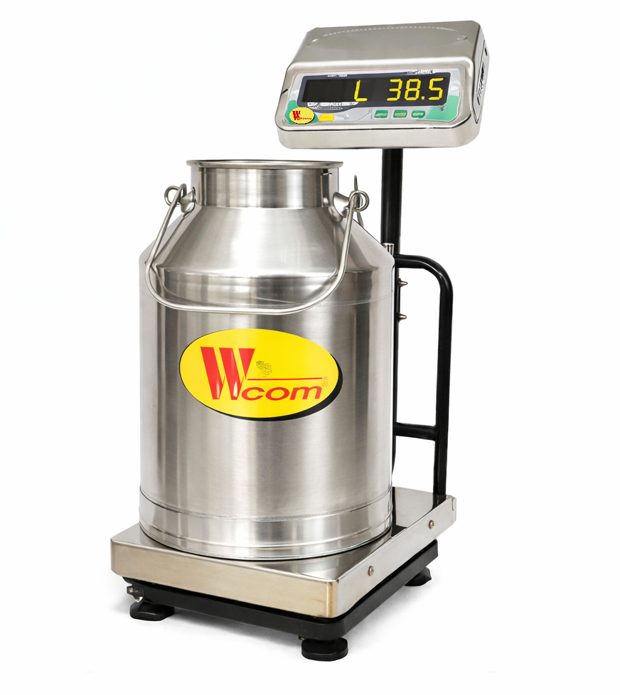 WICOM Platform-type 100 kg milk weighing scales are digital platform scales designed for accurate measurement of milk cans or containers at dairy farms and collection centers, typically featuring a flat stainless steel platform for easy placement of 40-liter cans.